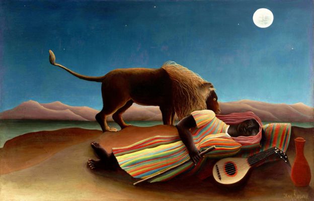 Rubens vẽ những bức săn sư tử rất cuốn hút. Delacroix cũng vậy. Trong bức 'Người Di-gan Ngủ' của Henri Rousseau (1897), một con sư tử dưới ánh trăng đánh hơi một nhân vật đang nằm ngủ bên cạnh cây đàn mandolin.