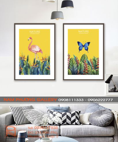 Tranh canvas bộ 2 hồng hạc và bướm xanh