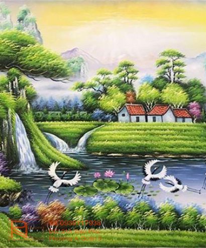 “Núi quản nhân đinh, nước quản tài lộc”, tranh sơn dầu sơn thuỷ có nước và có núi, giúp cho chủ nhân có sức khoẻ dồi dào, công việc làm ăn luôn luôn thuận lợi và tài lộc thịnh vượng.